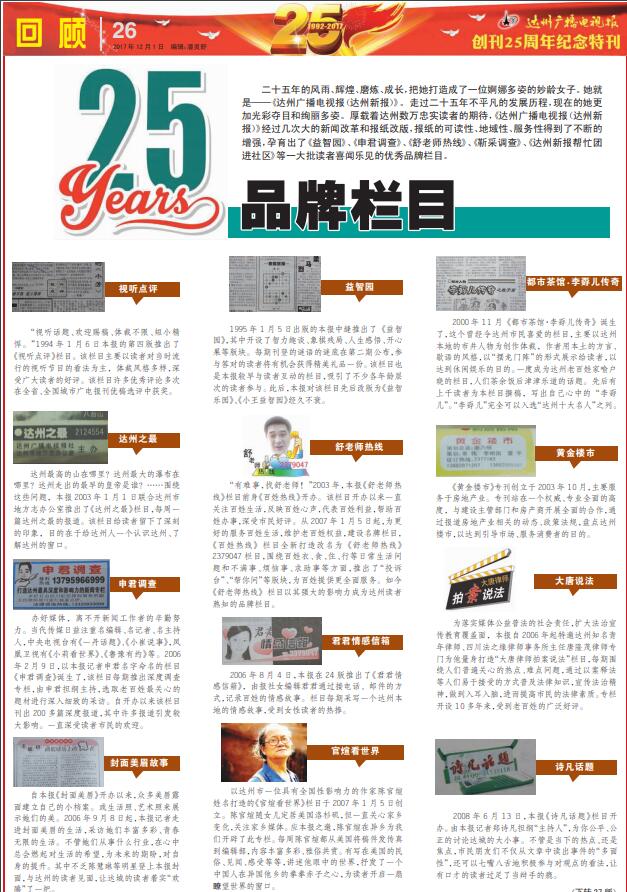 二十五年的風(fēng)雨、輝煌、磨煉、成長(zhǎng),把她打造成了一位婀娜多姿的妙齡女子。她就是——《達(dá)州廣播電視報(bào)(達(dá)州新報(bào))》。走過(guò)二十五年不平凡的發(fā)展歷程,現(xiàn)在的她更加光彩奪目和絢麗多姿。厚載著達(dá)州數(shù)萬(wàn)忠實(shí)讀者的期待,《達(dá)州廣播電視報(bào)(達(dá)州新報(bào))》經(jīng)過(guò)幾次大的新聞改革和報(bào)紙改版,報(bào)紙的可讀性、地域性、服務(wù)性得到了不斷的增強(qiáng),孕育出了《詩(shī)凡話題》等一大批讀者喜聞樂(lè)見(jiàn)的優(yōu)秀品牌欄目。